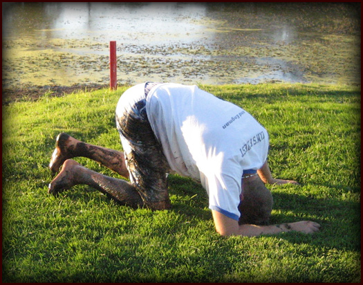 the Vaseline like mud that stuck all over his swimsuit/legs.
